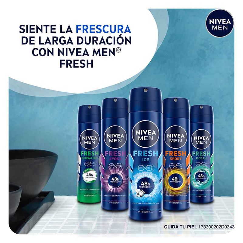 Desodorante antitranspirante de NIVEA MEN Fresh Ocean. Fórmula diseñada para hombres con fragancia intensa y frescura sin irritación. 48 horas de protección contra el sudor y el mal olor. 0% alcohol sin irritación.