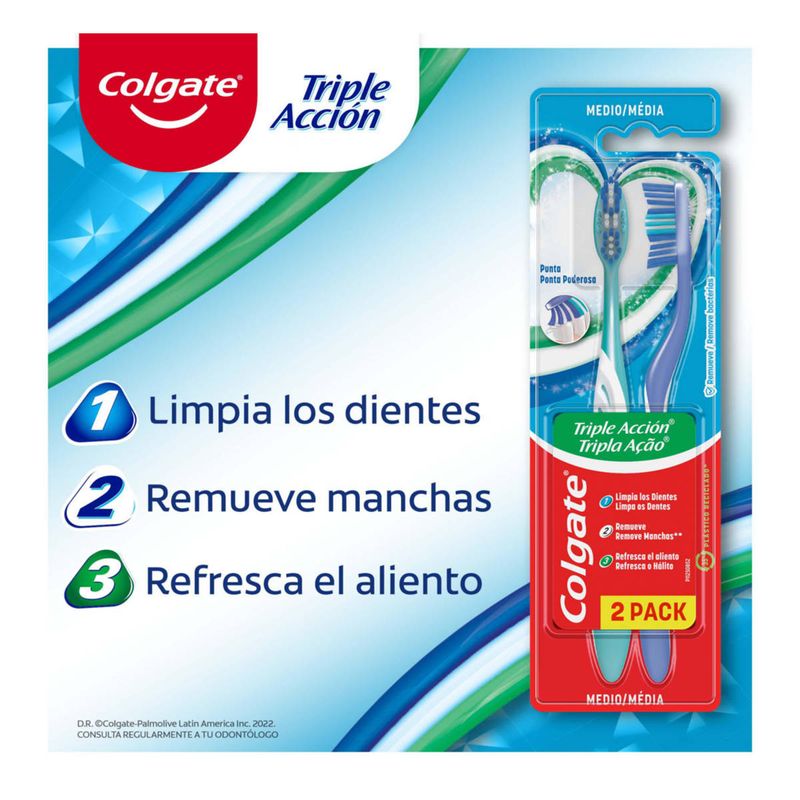 El Cepillo de dientes Colgate Triple Acción medio te ayudará a eliminar las bacterias que producen el mal aliento.