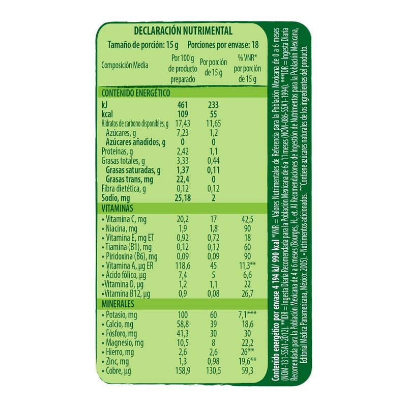 Cereal infantil Nestum etapa 1 cereal para bebé sabor arroz (lata 270g)Los Cereales Infantiles Nestum son la comida para bebé Fortificado con 15 Vitaminas y Minerales que ayudan a un sano crecimiento Con hierro que puede apoyar al desarrollo mental y cognitivo Fácil Digestión para el bebé Sin azúcar añadida. Los Cereales Infantiles de Nestum constituyen la base de la alimentación para tu bebé Cereal Infantil instantáneo: No requiere cocción Utiliza leche materna o la leche recomendada por tu profesional de la salud. Porción recomendadas: 15g (3 cucharaditas) de cereal ¿Primera comida del bebé? Dale lo mejor a tu bebé y sigue su desarrollo paso a paso.