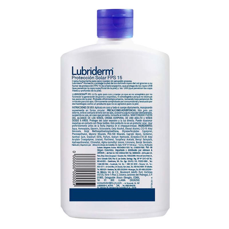 Lubriderm Protección Solar FPS 15 apta para cara y cuerpo humecta y protege la piel de los daños causados por la exposición al sol gracias a su factor de protección FPS 15 de amplio espectro, que protege de los rayos UVB y los UVA.