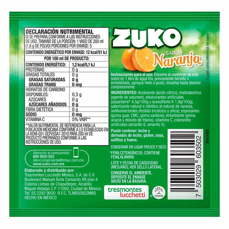 Zuko es la bebida instantánea que te ayuda en todo momento a dar sabor y variedad a tu familia. Acompaña tus comidas con el increíble sabor de Zuko naranja, que además está adicionado con Vitamina C. Cada sobre rinde 1 Litro.