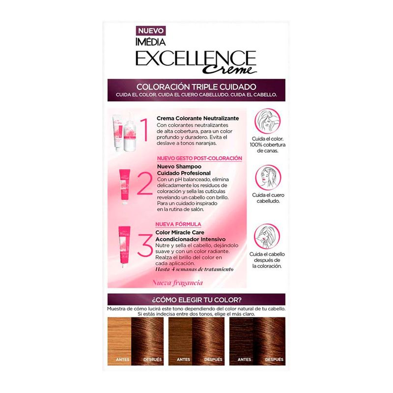 Dale a tu cabellera un tono deslumbrante y brillante al aplicar el Tinte para Cabello Imédia Excellence de L'Oréal 677 Chocolate Profundo.
